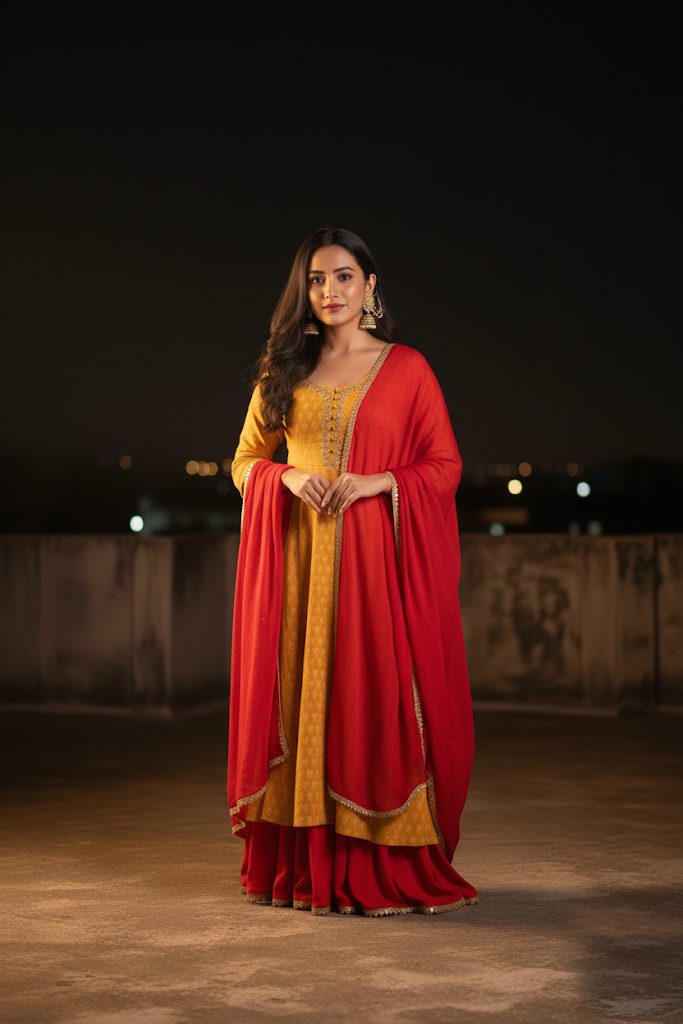 Mustard Red Kalidar Kurta Set -- A stunning cotton ensemble featuring a flared kalidar kurta with skirt, adorned with delicate gota work embroidery. Elegant, vibrant, and beautifully crafted for festive charm.