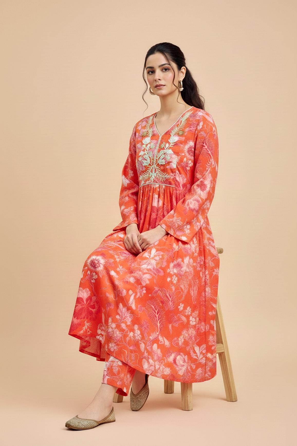 Add a pop of color to your wardrobe with this vibrant two-piece set. The soft modal kurta features a V-neck and full sleeves, adorned with delicate embroidery, paired with matching modal pants for a polished and comfortable look. Perfect for festive occasions, semi-formal gatherings, or daytime events, this orange co‑ord set blends elegance, style, and comfort effortlessly.