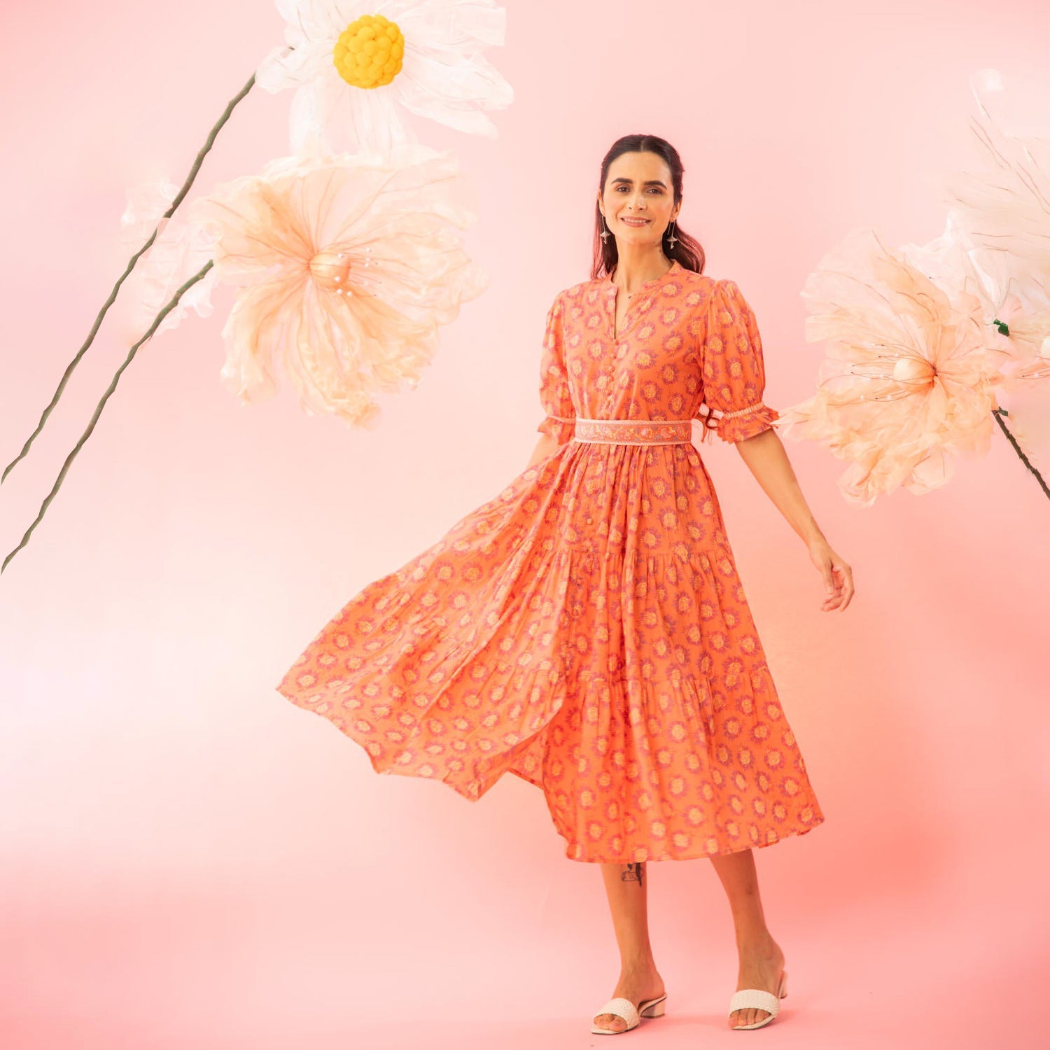 Orange Printed Tiered Maxi Dress with a Belt