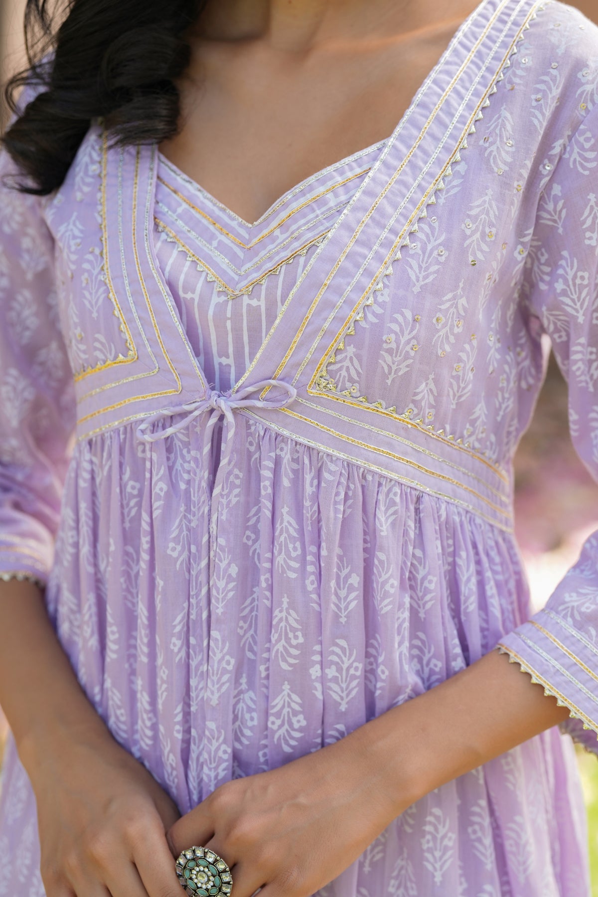 A breezy and elegant three-piece set perfect for summer festivities. The soft purpal mulmul shrug features a delicate Khari print, sequin-embroidered yoke, and gota lace on the borders. It has a gathered empire waist and front-tie tassels for a graceful drape. Layered over a spaghetti-strapped, side-slit printed kurta and paired with solid cambric pants, this set is designed for effortless charm and comfort.