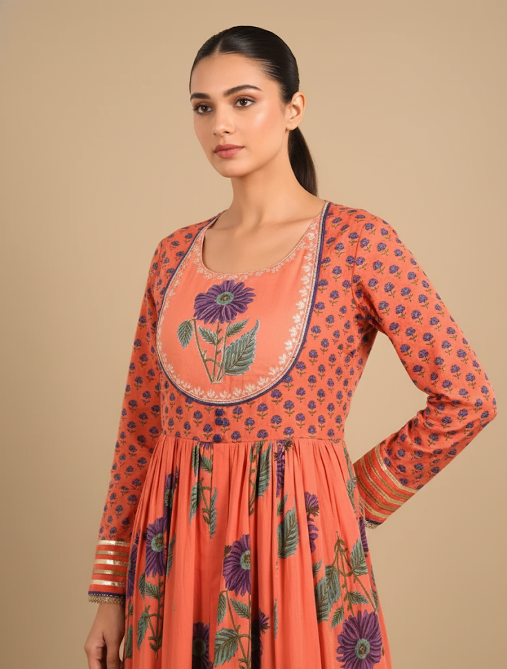 A vibrant orange cotton mulmul kalidaar kurta featuring all-over prints and delicate zari patch embroidery. Designed with a round neck, full sleeves, and ankle-length flare, this elegant piece offers a light, breathable, and festive look perfect for everyday elegance or special occasions.